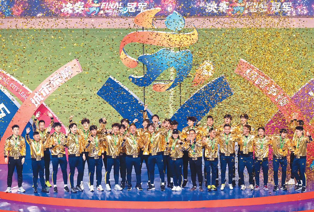 The victorious Taizhou soccer team clinch the championship at the 2025 Jiangsu Football City League final in the provincial capital Nanjing on last Saturday.